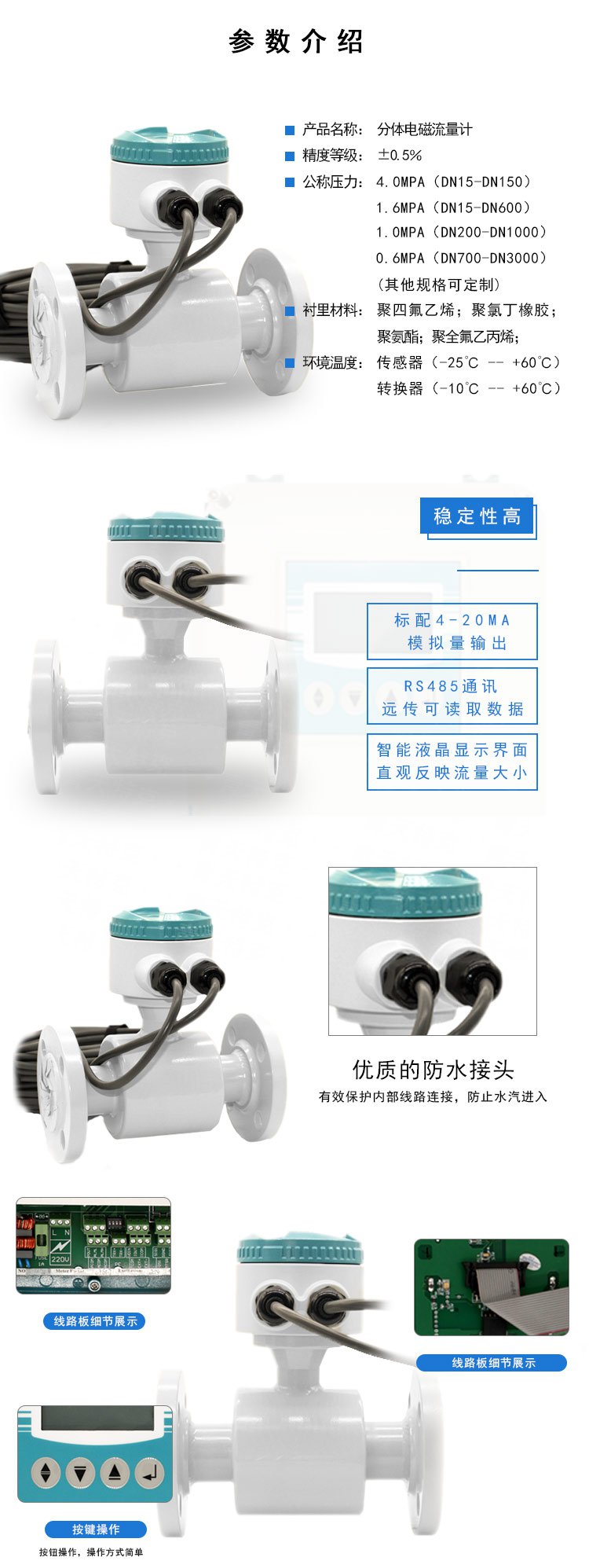 傳感器將感應電勢E作為流量信號,傳送到轉換器,經放大,變換濾波用一系列的數字處理后,用帶背光的點陣式液晶顯示瞬時流量和累積流量。轉換器有4~20mA輸出,報警輸出及頻率輸出,并設有RS-485等通訊接口,并支持HART和MODBUS協議。
