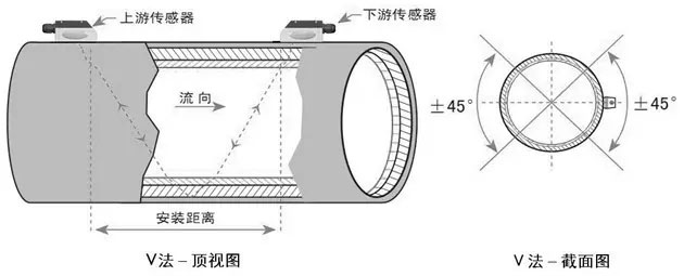 一般外夾式超聲波流量計可以稱規(guī)范安裝,這樣運用起來更加方便,計量同時更加的正確。在用這個方法安裝的時候,須要注重兩傳感器的水平線肯定要對齊,其中心線跟管道軸線也要水平相等,可測管徑規(guī)模為DN15到DN400。